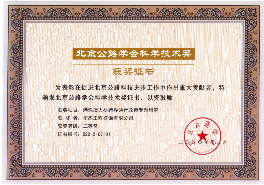 4月20日,2020年度北京公路學(xué)會(huì)科學(xué)技術(shù)獎(jiǎng)?lì)C獎(jiǎng)會(huì)在京召開(kāi)。華杰公司申報(bào)的《港珠澳大橋跨界通行政策專(zhuān)題研究》《新型城鎮(zhèn)化下普通國(guó)省干線公路功能分類(lèi)關(guān)鍵技術(shù)研究》兩個(gè)項(xiàng)目,分別榮獲2020年度北京公路學(xué)會(huì)科學(xué)技術(shù)獎(jiǎng)二、三等獎(jiǎng)。